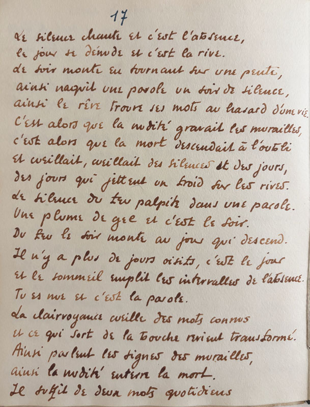 23 pages 20 x 14,8 cm à l’encre bleu et sépia, couverture de suédine noire rempliée, sous une élégante chemise et étui de l’Atelier Devauchelle. Manuscrit autographe complet aux encres de couleurs du plus important recueil poétique de l’auteur, il est signé et daté 1930 et dédié à la poétesse Marcelle Ferry qui fut un temps la compagne de l’auteur. Il sera publié en volume en 1933 aux éditions des Cahiers Libres. Le manuscrit a été offert à Paul ELUARD, il comporte une très belle dédicace à l’encre noire page de titre : à toi, mon cher Paul, plus que volontiers, avec joie, de tout cœur, à toi, dont l’amitié et les poèmes, me sont précieux et plus encore
