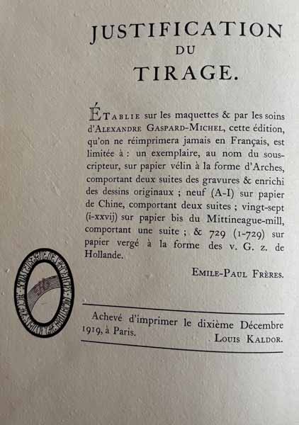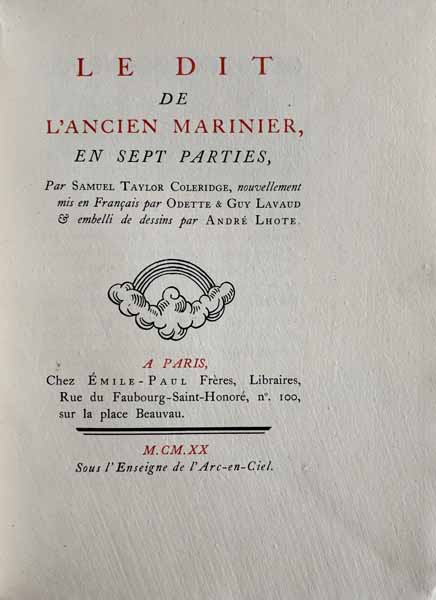 Nouvellement mis en français par Odette et Guy Lavaud et embelli de dessins par André LHOTE. Paris, Émile-Paul frères, 1920, in-8, broché, sous couverture muette rempliée de papier goudron revêtue d'un treillis de fil brun, étiquette de titre ornée contrecollée sur le premier plat, non coupé, 48 p. Edition originale de cette traduction. 1/27 ex. sur papier bis du Mittineague-mill, avec une suite à part des 11 gravures sur bois d’André LHOTE en noir sous couverture distincte avec pièce de titre. Superbe ouvrage, rare en grand papier. - On joint : Même ouvrage en édition anglaise : The Rime of the Ancyent Marinere, with designs by André LHOTE. Exemplaire numéroté sur Dutch v.G.z. handmade laid paper. Les deux volumes
