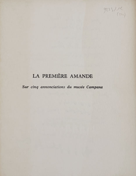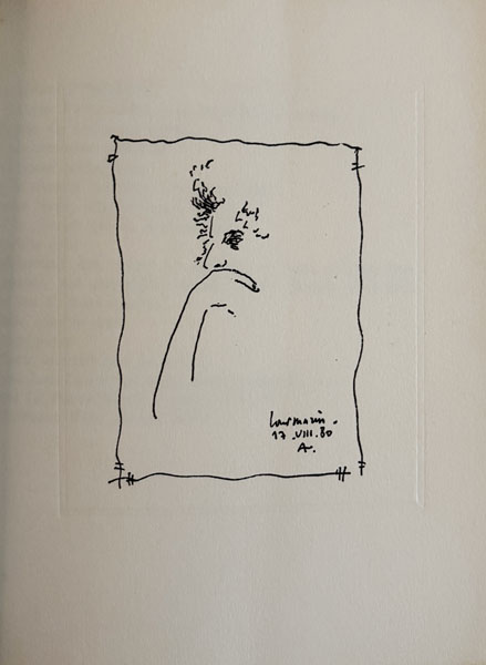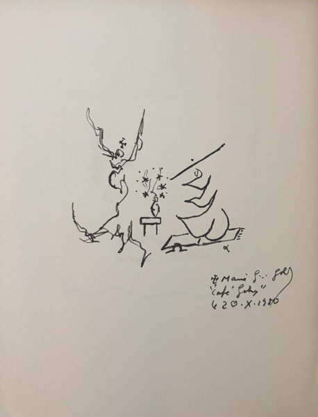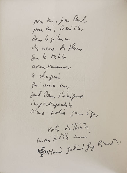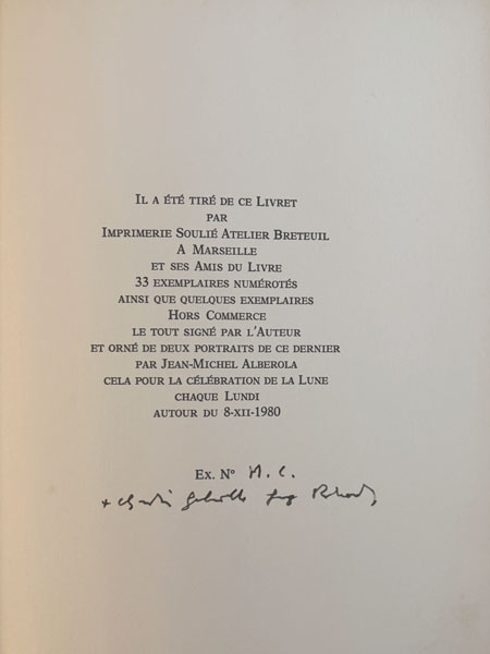 GUEZ RICORD (Christian Gabrielle). La première amande. Sur cinq annonciations du musée Campana. La Nouvelle Ephèze, Les Ascenseurs de la Vierge Marie. [Marseille, Imprimerie Soulié Atelier Breteuil], 1980, in-8, en feuilles, couverture rempliée, n.p. Edition originale tirée uniquement à 33 ex. sur papier d’Arches, celui-ci H.C. justifié et signé au colophon par Guez Ricord, orné de 2 portraits de l’auteur par Jean-Michel Alberola et d’un dessin original signé et daté en fin de volume de l’auteur. Bel envoi autographe signé pleine page à Jean-Paul Guibbert. Ajout autographe. 300 € |