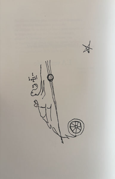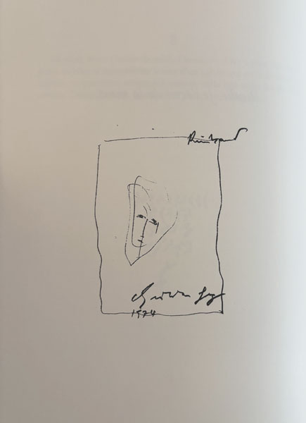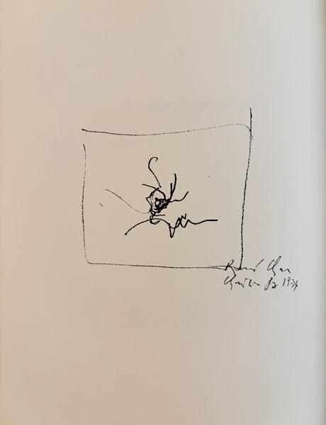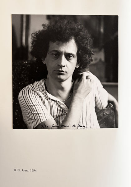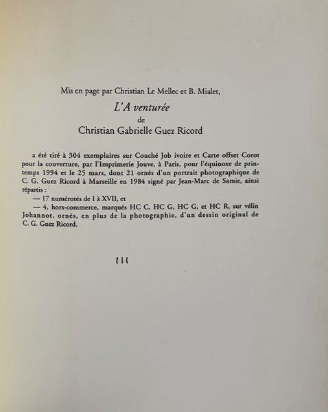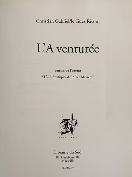 GUEZ RICORD (Christian Gabriel/le). L'A venturée. Dessins de l’auteur. Marseille, Librairie du Sud, 1994, in-8 carré, couverture rempliée, non paginé (une centaine de pages). Edition originale tirée à 304 ex. sur Couché Job ivoire, celui-ci 1/21 de tête orné d’un portrait photographique de Guez Ricord à Marseille en 1984 signé et justifié à l’encre noire par Jean-Marc de Samie. Dans ce recueil quelques textes critiques (Charles Racine, Rimbaud, Bonnefoy, Jaccottet, Jabès, etc.) 250 € |