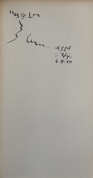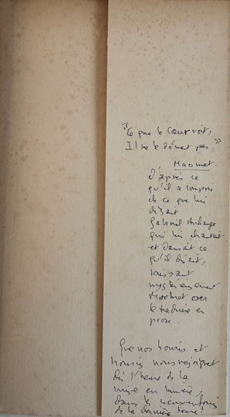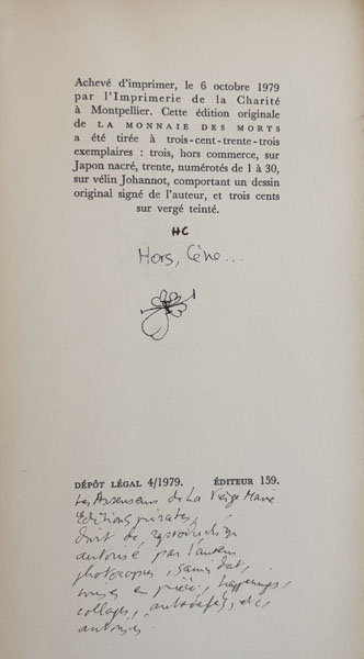 Montpellier, Éditions Fata Morgana, 1979, in-8, broché, couverture rempliée. Edition originale. 1/30 ex. de tête sur vélin Johannot, comportant un dessin original signé de l’auteur. Très long envoi autographe signé sur plusieurs pages à Jean-Paul Guibbert. Annotations manuscrites de l’auteur à plusieurs endroits (notamment en fin de volume et même au rabat de la couverture). Agrémenté en outre de plusieurs petits dessins originaux. Une photographie originale en couleurs (13,5 x 9 cm), C.G.G.R. devant un village du Lubéron. Annoté au dos: Pour votre livre de messe… Des rousseurs, surtout sur la couverture… mais exemplaire unique.