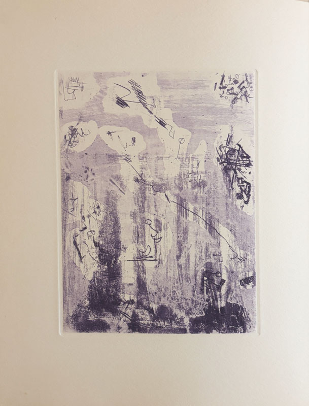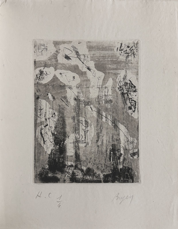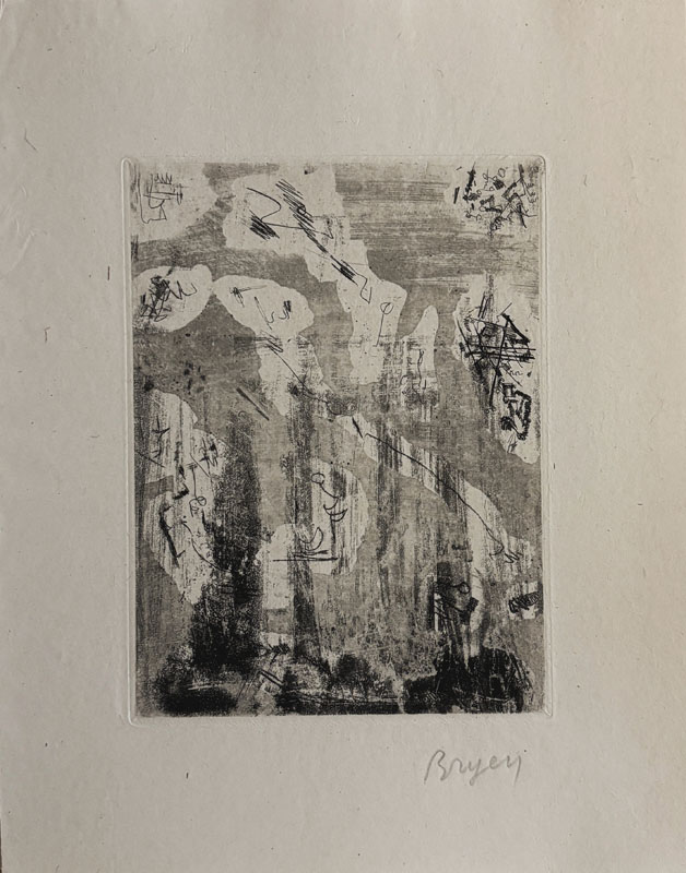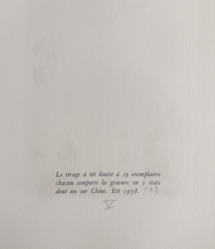 Catégorie(s) : Livres illustrésARTAUD (Antonin). BRYEN (Camille). Voici un endroit. Voici un endroit. Alès, P.A.B., été 1958, petit in-4 (25,5 x 20,8 cm), en feuilles, couverture rempliée. Édition originale tirée uniquement à 19 exemplaires num. sur vélin d’Arches (n° V), signé par l’éditeur, avec une eau-forte originale tirée en 5 épreuves en différents tons de Camille Bryen, la dernière sur papier de Chine est signée. Il a été ajouté un autre état également sur Chine et signé. 1500 € |