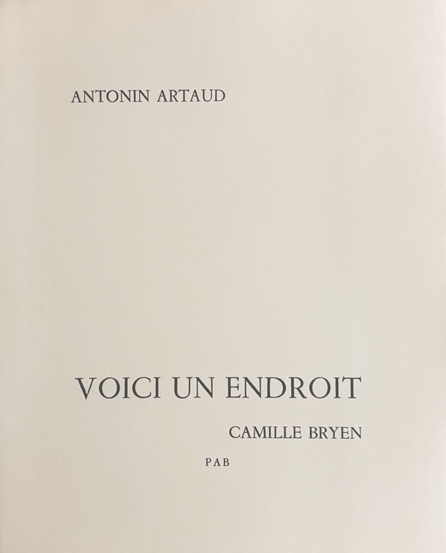 25852 ARTAUD (Antonin). BRYEN (Camille). Voici un endroit. Voici un endroit. Alès, P.A.B., été 1958, petit in-4 (25,5 x 20,8 cm), en feuilles, couverture rempliée. Édition originale tirée uniquement à 19 exemplaires num. sur vélin d’Arches (n° V), signé par l’éditeur, avec une eau-forte originale tirée en 5 épreuves en différents tons de Camille Bryen, la dernière sur papier de Chine est signée. Il a été ajouté un autre état également sur Chine et signé.