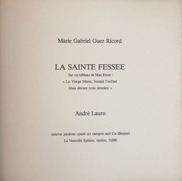 GUEZ RICORD (Marie Gabriel). La Sainte fessée. Sur un tableau de Max Ernst : « La Vierge Marie, fessant l’enfant Jésus devant trois témoins ». [Marseille], Sanctus Pankras Spank Art Campus and C° illimited, 1981, La Nouvelle Ephèze, station, 51980, in-8 carré, en feuilles, couverture rouge imprimée. Edition originale. Hors-texte par André Lauro. Tirage à 100 exemplaires. 1/82 num. sur Vélin d’Arches, signé par l’auteur et l’illustrateur. Légère décoloration au dos.
