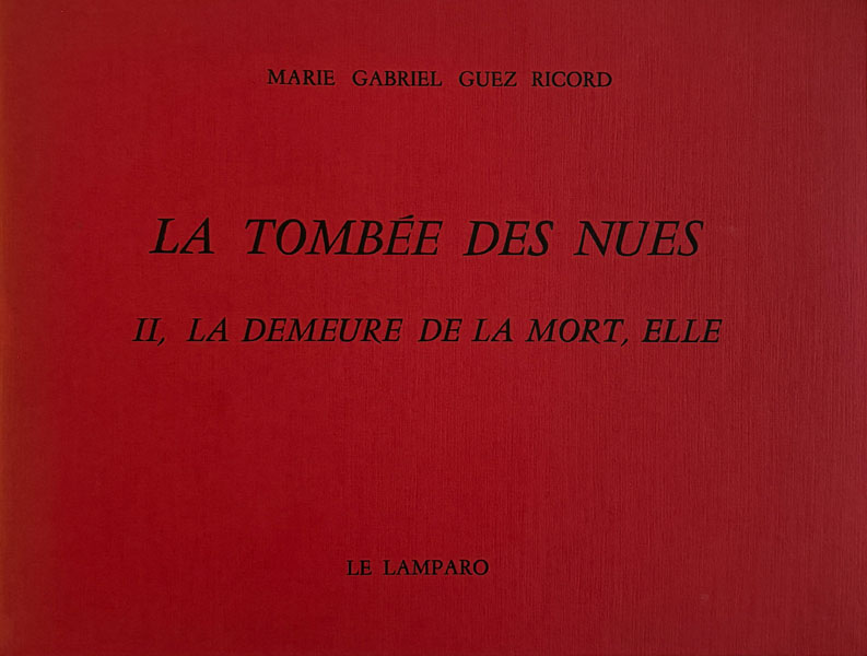 GUEZ-RICORD (Marie Gabriel). La Tombée des Nues. I, L’avoir été. II, La demeure de la mort, elle. L’Isle-sur-la-Sorgue, Le Lamparo, 1980-1981, 2 volumes in-8 à l’italienne, brochés, non paginé. Edition originale. Tirés à part du 8ème et 10ème Lamparo à 99 ex. 1/25 de tête num. sur vélin d’Arches pour le I, justifié et signé par l’auteur. Insolation à la couverture. 1/99 num. sur Ingres d’Arches, tirage unique, pour le II.