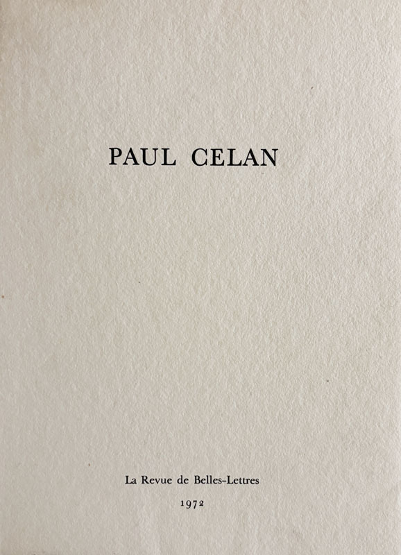 (CELAN). Celan-Lestrange (Gisèle), Tal Coat (Pierre) et Bram Van Velde. REVUE DE BELLES-LETTRES. Paul Celan. (Genève), La Revue de Belles-Lettres n° 2 et 3, (Société de Belles-Lettres), 1972, in-4, broché, couverture rempliée, 129 pages. Edition originale. 32 poèmes et deux discours inédits de Paul Celan, textes allemand / français, traduction en vis à vis. Textes d'Yves Bonnefoy, Henri Michaux, Jean Daive, André du Bouchet, Jacques Dupin, J. Starobinski, Maurice Blanchot, Emmanuel Levinas, etc. Illustrations de Gisèle CELAN-LESTRANGE, Pierre TAL COAT et BRAM VAN VELDE. 1/122 ex. de tête num. sur vélin à la cuve, comprenant une eau-forte de Gisèle Celan-Lestrange, une pointe-sèche de Pierre Tal Coat et une lithographie de Bram Van Velde, toutes tirées sur vélin d'Arches et justifiées et signées par les artistes. Très bel exemplaire, non coupé.