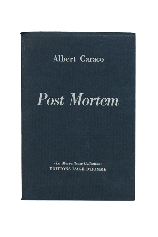 CARACO (Albert). Post Mortem. Lausanne, Éditions l’Age d’Homme, La Merveilleuse Collection, 1968, in-8, broché, couverture rempliée, 119 pages. Edition originale. Véritable chef-d’œuvre de ce curieux personnage que fut Albert Caraco. Ce livre fut réédité par Michel Camus en 1983 aux éditions Lettres Vives sous le titre Madame Mère est morte. 1/17 ex. de tête num. sur papier Johannot à la cuve.