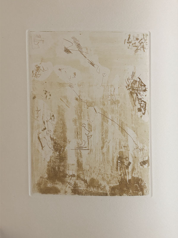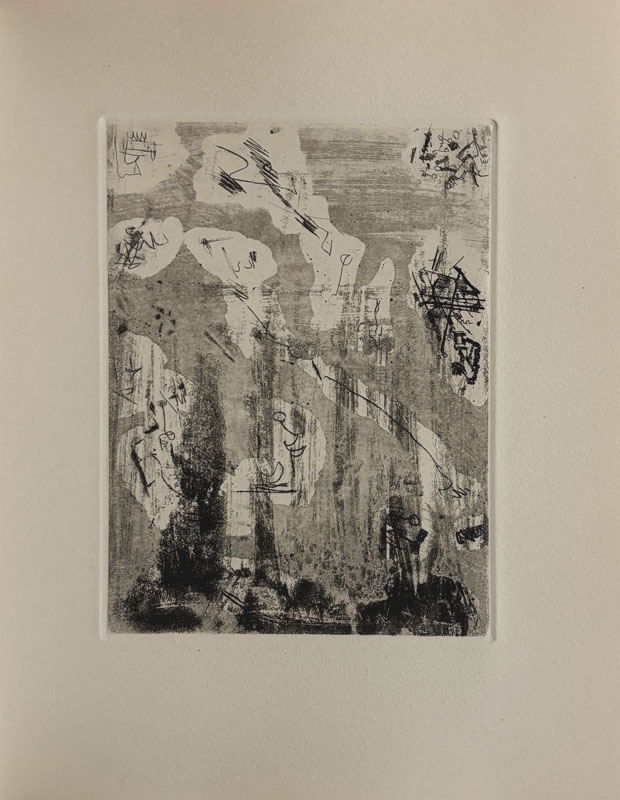 Voici un endroit. Alès, P.A.B., été 1958, petit in-4 (25,5 x 20,8 cm), en feuilles, couverture rempliée. Édition originale tirée uniquement à 19 exemplaires num. sur vélin d’Arches (n° V), signé par l’éditeur, avec une eau-forte originale tirée en 5 épreuves en différents tons de Camille Bryen, la dernière sur papier de Chine est signée. Il a été ajouté un autre état également sur Chine et signé.