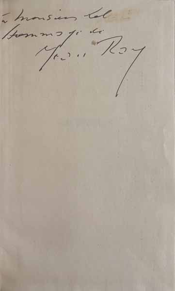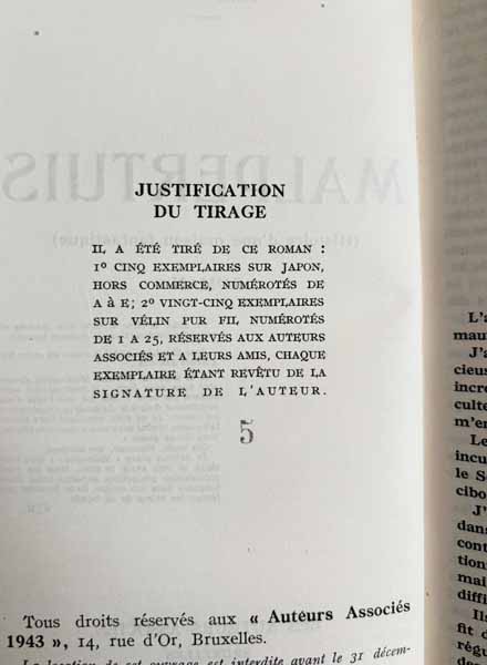 Bruxelles, Les Auteurs Associés, 1943, in-12, cartonnage noir de l’éditeur. Édition originale de l’un des plus grands et des plus célèbres romans du genre. 1/25 num. sur vélin pur fil, ceux-ci réservés aux Auteurs Associés et à leurs amis, seul tirage en grand papier avec 5 Japon hors commerce. Ces exemplaires se présentent dans un simple cartonnage de toile noire, avec le nom de l’auteur et le titre tiré or sur le dos et le premier plat. Envoi autographe signé de l’auteur, le nom du destinataire partiellement effacé mais toujours lisible. Fort rare en grand papier.