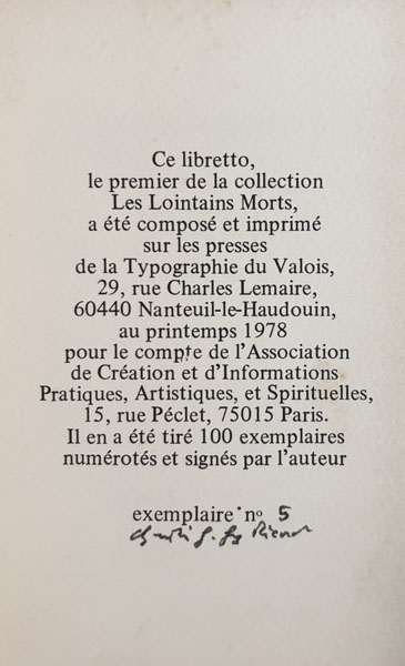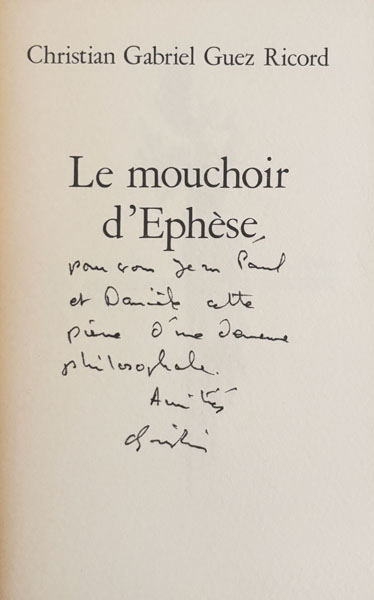 GUEZ RICORD (Christian Gabriel). Le mouchoir d’Ephèse. S.l. [Paris], collection Les Lointains Morts (1), 1978, in-12, en feuilles, non paginé. Edition originale tirée à 100 ex. sur papier d’Arches, justifié et signé par l’auteur. Cette plaquette est le supplément à la revue Avalanche, printemps 1978. Bel envoi autographe signé à Jean-Paul et Danièle [Guibbert]. Dos légèrement bruni. 250 € |