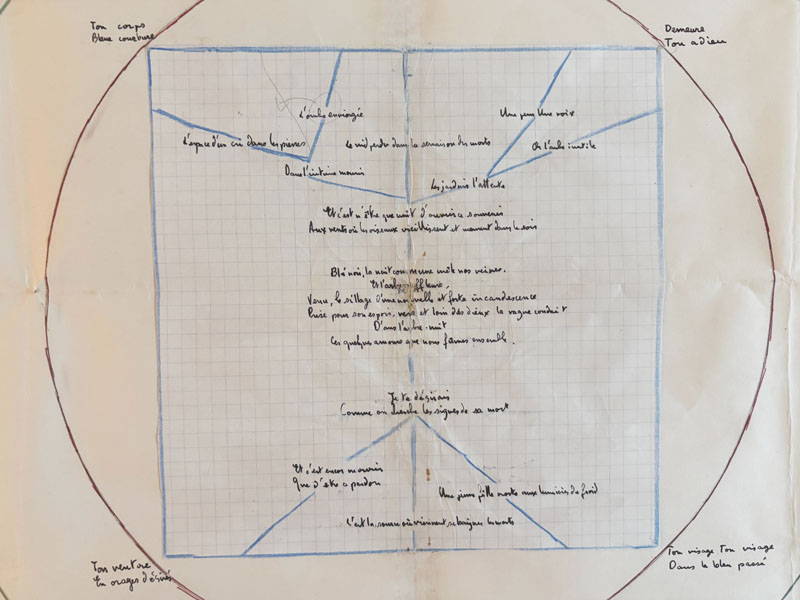 GUEZ RICORD (Christian Gabriel) sous le nom de Christian GUEZ. L’Arbre-nuit. Dessin original en couleurs et manuscrit autographe à l’encre noire. Grand dessin, sorte de diagramme, crayon de papier, crayons de couleurs et stylo Bic, titré et daté L’Arbre-nuit, le 3 mai 1967. Format: 59, 5 x 42 cm. Il est composé d’un manuscrit sur papier ligné contrecollé sur une feuille à dessin entouré de cercles de couleurs avec des textes manuscrits dans les partes médianes. Ce dessin, dans l’esprit de ceux de son premier recueil, est resté longtemps plié, il a été restauré et mis à plat. 400 € |