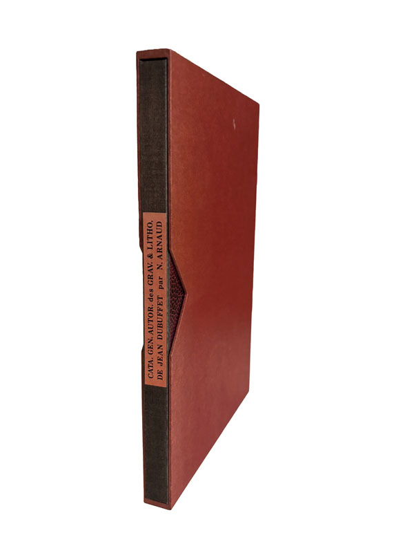 25862 DUBUFFET (Jean). ARNAUD (Noël). Catalogue général autoritaire des gravures et lithographies de Jean Dubuffet constitué en 1961 par Noël Arnaud et imprimé aux frais d’Asger Jorn pour son bon plaisir à l’occasion de l’exposition de ces ouvrages au Musée de Silkeborg. Répertoire établi par Noël Arnaud des oeuvres exécutées jusqu’au mois d’avril 1961. Musée de Silkeborg (Danemark), 1961, in-8 (24 x 16 cm) broché, paginé de 177 à 259. Chemise étui, avec un plat ajouré, de Thérèse Treille. Tirage à part à grandes marges du catalogue général autoritaire des gravures et lithographies de Jean Dubuffet. Comprend les textes en français du catalogue général, à l’exclusion de la partie photographique et des textes en danois, mais avec un texte de présentation de Jean Dubuffet et des pages d’éclaircissements, de corrections et de supplément. Tirage unique à 18 exemplaires (celui-ci n°2) sur papier Ingres Lana sous une couverture lithographique en trois couleurs tirée sur papier d’Arches spécialement conçue par Dubuffet (24 x 33,5 cm). Très rare.Webel, 772.