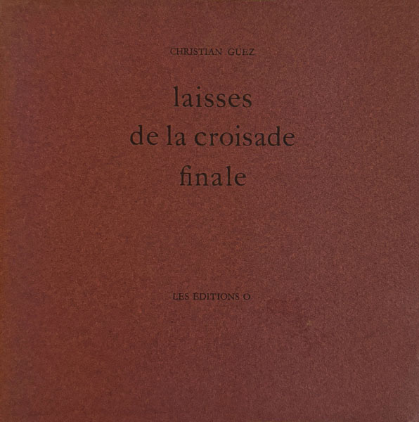 25802 [GUEZ RICORD (Christian Gabriel/le)]. GUEZ (Christian). Laisses de la croisade finale. Sans lieu, Les éditions O, 1968, in-12 carré, en feuilles, couverture rempliée. Edition originale. Tirage unique à 60 ex. tous num. sur Arches, celui-ci n° 5. Long envoi autographe signé à Jean-Paul Guibbert.