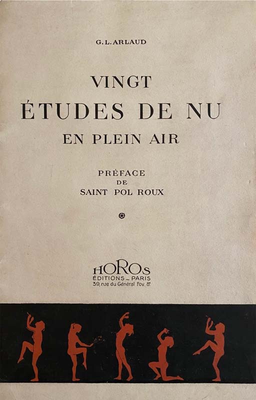 Préface de Saint-Pol-Roux. Paris, Horos (1921), in-folio (27,2 x 42,5 cm), en feuilles sous couverture cartonnée à rabats de l’éditeur, 8 p. + 20 planches. Edition originale du poème de Saint-Pol-Roux, Hosanna, hymne à la nature et à la nudité. 20 planches en héliogravure sur papier vélin. « Vingt études de nu en plein air, luxueuse collection de planches signées G.-L. Arlaud, est probablement la plus précieuse publication naturiste française de l’époque. A la différence des publications allemandes où il semble se fondre dans la nature qui l’entoure, le personnage s’impose ici dans une prédominance absolue, comme si il était le centre de l’univers ». Alessandro Bertolotti, Livres de nus, Maison Européenne de la Photographie, p. 40. Rare portfolio, surtout complet et en bel état.