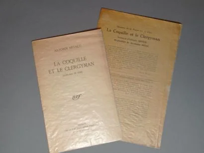 Paris, Extrait de la Nouvelle Revue Française, 1er novembre 1927, plaquette in-8, broché de 7 p. sous couv. Edition originale. Tiré à part de la N.R.F. à quelques exemplaires. On joint: La Coquille et le Clergyman. Scénario d'Antonin Artaud. Réalisation de Germaine Dulac. Paris, 1927. Double feuillet grand in-8 (24,5 x 16,5 cm) imprimé recto-verso. Plaquette compilant des extraits de presse autour du film La Coquille et le Clergyman, textes entre autres de Roger Vitrac, co-fondateur avec Artaud du Théâtre Alfred Jarry. Rares documents.