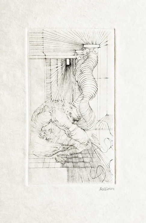 Paris, Georges Visat, 1967, in-8 (24 x 16,5 cm), en feuilles, couverture blanche rempliée avec titre gaufré, étui-chemise noir de l'éditeur avec semis de petites étoiles et une étiquette rose. Tirage unique à 165 ex. num. sur vélin de Rives (seul tirage). 7 gravures à pleine page de Hans Bellmer dont 1 en couleurs pour le frontispice, avec une suite des gravures sur Japon Hosekawa. Les 14 gravures sont signées au crayon par Bellmer. " L'Anglais décrit dans le château fermé inspira à Hans Bellmer une suite de sept gravures au burin et à la pointe de diamant qui sont parmi les plus belles que l'on sache de lui et qui auraient dû illustrer un tirage de luxe de la première édition (…) Presque quinze ans plus tard, en 1967, ces gravures furent publiées avec un texte de Bellmer. Aisément l'on y reconnaîtra divers personnages et diverses scènes de L'Anglais ". (André Pieyre de Mandiargues, Préface à la première édition N.R.F. de L'Anglais, 1979, p. 14-15). Œuvre gravé, pp. 65-68.Parfait état.