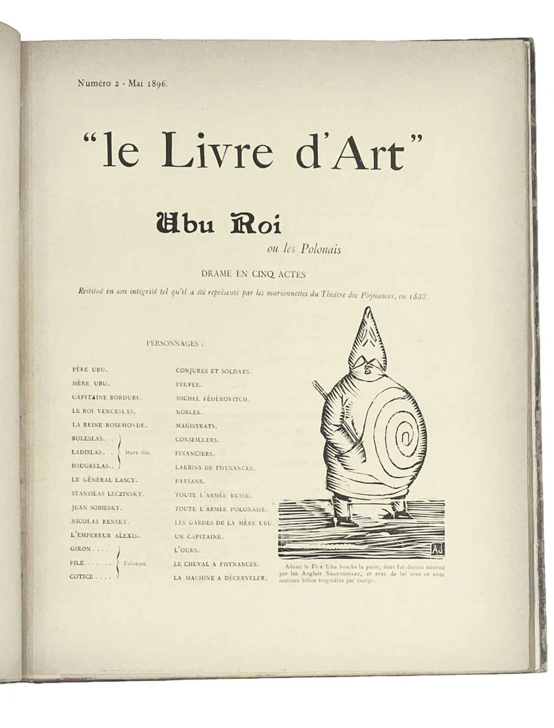 Revue Artistique et Littéraire illustrée de Planches originales. Paris : " L'Épreuve " Journal-Album d'Art, n°1 à 4, mars - juillet 1896, 4 fascicules en 1 volume in-4 (28 x 22,2 cm), demi-percaline rouge à la bradel, pièce de titre, lettres dorées, couv. cons, non rogné (reliure de l'époque).COLLECTION COMPLÈTE DE CETTE RARE REVUE. Spécialisée dans la publication d'estampes originales, son éditeur était l'Épreuve, Journal-Album d'Art. Le rédacteur en chef était Paul Fort et le directeur artistique l'imprimeur et maître-graveur Maurice Dumont. Textes et poèmes de Fr. Jammes, Jean de Tinan, A. Lebey, L.-P. Fargue, Ch. Guérin, H. Bataille, P. Fort, A. Jarry, H. van de Putte, Saint Georges de Bouhélier, etc. Illustrés entièrement de bois originaux in et hors-texte de G. d'Espagnat, M. Dumont, Ch. Huard, H. Guérard, J. Danguy, G. Jeanniot, M. Denis, etc. On peut lire dans les annonces des publicités en caractères minuscules pour l'Ymagier (revue dirigée par Jarry et Remy de Gourmont) et le Perhinderion (Jarry seul). Édition pré-originale d'Ubu Roi. Le tirage du bois original (7,4×11,3 cm) intitulé : Véritable portrait de Monsieur Ubu, est donné ici pour la toute première fois (n° 2 de la revue, 25 avril 1896). Publiée dans les numéros 2 et 3 de la revue, la pièce sera représentée pour la première fois le 10 décembre 1896, sur les planches du Théâtre de l'œuvre, que Paul Fort participa à créer aux côtés de Lugné-Poe. L'achevé d'imprimer de l'édition en volume, au Mercure de France, est du 11 juin 1896. Le bois sera ensuite repris en couverture de la Revue Blanche, puis en couverture du Moutardier du Pape en 1907. Mais, mais, mais… du Véritable portrait seul celui qui figure dans le Livre d'Art est un véritable tirage du bois gravé par Jarry, par la suite il ne s'agit le plus vraisemblablement que de reproduction-clichés. La matrice du bois original montée dans l'exemplaire d'Ubu Roi de Laurent Tailhade relié par Paul Bonet figurait dans l'Expojarrysition en 1953. Jean Loize en fit tirer pour l'occasion une vingtaine d'exemplaires. On peut voir le monogramme "R.G. " en bas du dos de la reliure ; peut-être s'agit-il de l'exemplaire de Remy de Gourmont.