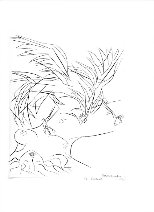 Grenoble, 22 janvier 1947, 6 pages recto verso in-4 et 7 gravures signées, enveloppe cartonnée conservée avec l'adresse d'André Breton, 42, rue Fontaine. Varbanesco propose à André Breton de collaborer à un numéro spécial de la revue Variété, il lui demande un texte-pivot traitant de la coïncidence. Il l'assure de la collaboration du Dr Mabille (Pierre). Les deux tiers de la revue seront consacrés à la question de la coïncidence et un tiers présentera les gravures " sur caillou " et des documents du jardinier Guillermin qui vivait à St Oudras dans l'Isère. Également des traductions de l'œuvre d'Urmuz l'écrivain roumain dont “vous avez entendu parler et qui fut précurseur”. Varbanesco revient sur l'idée de Breton d'une enquête sur la coïncidence dont les réponses les plus significatives auraient été publiées. La réunion de ces textes serait l'étape préliminaire pour une prochaine anthologie. Enfin la question de la division du contenu du numéro se pose : soit selon les auteurs, soit par spécialités dans les domaines scientifiques, poétiques, etc. Varbanesco demande l'opinion de Breton sur toutes ces questions. En post scriptum : “je me fais le plaisir de vous envoyer quelques planches extraites d'un travail actuellement en cours pour les Chants de Maldoror que je prépare pour les éditions Bordas”. Joint : 7 estampes signées et toutes annotées au crayon par Varbanesco : 1 planche Les chasseurs d'ours de St Ondras par eux-mêmes copie d'après une gravure sur " caillou " du jardinier Guillermin, 6 épreuves d'artiste inédites pour les Chants de Maldoror : Ier chant le fond de l'océan (eau-forte sur zinc), Chant Ier …gonflent leur cou terrible (5ème, 8ème et planche définitive), Chant IIIe, au bordel (planche définitive et 20ème planche). Varbanesco donné des illustrations pour le n°9 des Cahiers G.L.M. ainsi que pour le n°5 de la revue Le Temps de la poésie. On joint: Dépliant de l'exposition VARBANESCO à la Galerie Mai à Paris, du 14 au 30 mai 1946, 1 feuille A4. Texte de Louis Parrot au verso “Varbanesco ou Histoires naturelles” et une transcription complète de la lettre. Les archives Varbanesco sont déposées au musée de Valence.