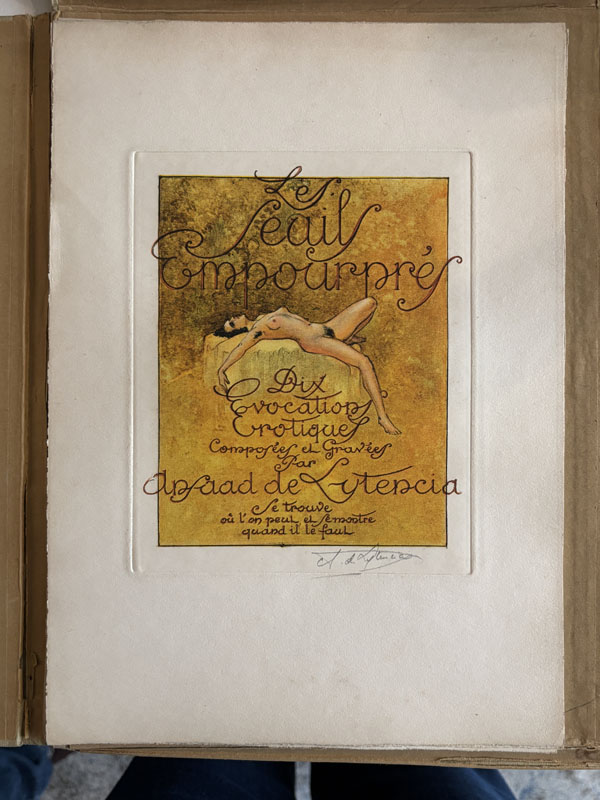 Dix évocations érotiques composées et gravées par Ansaad de Lytencia. Se trouve où l'on peut et se montre quand il faut. 1927, 15 planches gravées in-4 (31,5 x 22 cm) sous portefeuille muet de l'éditeur toilé avec cordonnets. Tirage unique 225 exemplaires, celui-ci sur vélin d'Arches, de cette suite érotique de 10 eaux-fortes coloriées à la poupée. Suite particulièrement hardie et sulfureuse. Le titre est gravé dans un frontispice puis suivent deux planches, la dédicace "à nos épouses..." et deux citations d'Oscar Wilde, puis les 10 planches titrées ainsi: L'Initiation, Mysticisme, Insignifiances, Les Invertis, Réversibilité, La Danse, Le Poisson rouge, La Possession, Sérénité, Finale - et enfin deux planches; une avec citation de Baudelaire et une à la justification de tirage. La première planche est signée au crayon. Longtemps attribué à au graveur André Lambert on sait aujourd’hui que sous le nom d’Ansaad de Lytencia se cachait le peintre-graveur Georges Guinégault.