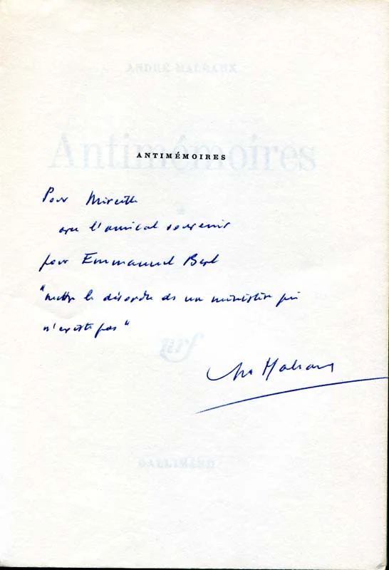 P., N.R.F., 1967, in-8, br., 605 p. Edition originale. ex. du S.P. enrichi d’un envoi a.s. à Emmanuel BERL : “Pour Mireille avec l’amical souvenir, pour Emmanuel Berl “Mettre le désordre dans un ministère qui n’existe pas” André Malraux”. L’auteur reprend avec malice une anecdote racontée par Henri Jeanson (L’Aurore, 10 octobre 1967) : Jeanson avait demandé à Emmanuel Berl en décembre 1945 en quoi consistaient les fonctions de Malraux, ministre de l’Information, et -s’était entendu répondre : « Oh, rien de plus simple. Il s’efforce de mettre du désordre dans un ministère qui n’existe pas… »