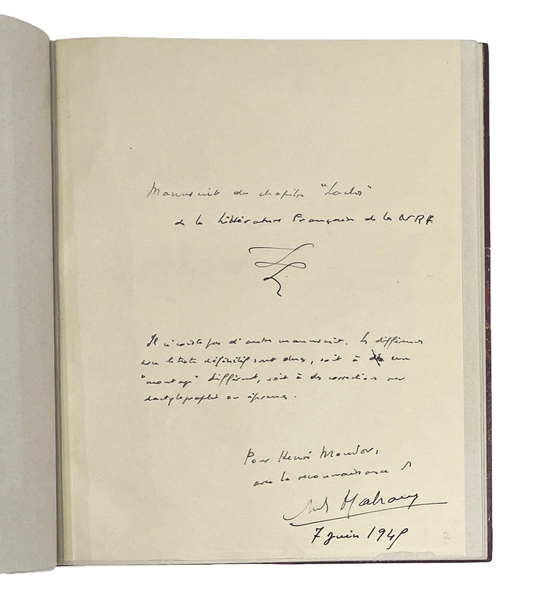 27 feuillets in-4 et in-8, numérotés 1 à 22 (dont 2bis, 2ter, 13bis dactylographié, 17bis et 17ter avec deux lignes dactylographiées) montés sur onglets et interfoliés de feuilles de vergé gris. Relié en un volume in-4 (27,2×22,5 cm), demi-maroquin bordeaux à coins, dos à 5 nerfs ornés de caissons à triples encadrements de filets dorés, tête dorée (F. et A. Maylander). MANUSCRIT AUTOGRAPHE DE LA CÉLÈBRE ÉTUDE SUR CHODERLOS DE LACLOS ET LES LIAISONS DANGEREUSES, parue dans le tome II de l'ouvrage collectif " Tableau de la Littérature Française " (N.R.F., 1939). En 1970, Malraux la publiera à nouveau dans " Le Triangle noir " avec deux autres textes, sur Goya et Saint-Just. Elle sera reprise en préface du roman aux éditions du Livre de Poche puis Folio-Gallimard. Le volume s'ouvre par une lettre autographe adressée à son cher Professeur, Henri Mondor (1 page in-12, 7 juin 1945), auquel Malraux offre ce manuscrit. Sur la page de titre autographe qui suit, datée du même jour, dédicacée et signée, l'auteur précise qu'il n'existe pas d'autre manuscrit. Les différences avec le texte définitif sont dues, soit à un montage différent, soit à des corrections sur dactylographie ou épreuves. Bien que de premier jet, ce manuscrit est très proche de la version imprimée. Malraux met en évidence l'originalité et la modernité des Liaisons dangereuses. Il débute par une synthèse du roman : Laclos entre prend de raconter une anecdote de sa jeunesse : une femme abandonnée par son amant décide de faire coucher n'importe qui avec la fiancée de celui-ci, pour qu'il soit trompé avant même son mariage. Il y ajoute l'histoire d'une autre femme qui, séduite et quittée par un complice de la première, meurt de chagrin. Puis il en définit l'essence même : Les Liaisons sont le récit d'une intrigue. (Comme par hasard, ce mot désigne à la fois l'organisation des faits dans un ouvrage de fiction, et un ensemble efficace et orienté de tromperies.) Intriguer tend toujours " à faire croire " quelque chose à quelqu'un ; toute intrigue est une architecture de mensonges; croire à l'intrigue, c'est croire d'abord qu'on peut agir sur les hommes, - par leurs passions, qui sont leurs faiblesses […] Le problème technique du livre est de savoir ce qu'un personnage va faire croire à un autre. D'où une ronde d'ombres Louis XV à la merci des deux meneurs du jeu. Pour Malraux, Laclos renouvelle la notion d'intelligence, idée passionnelle et mythique. Il analyse aussi une autre nouveauté : La passion s'est métamorphosée : elle était fatalité, elle devient désir. Mais, observe-t-il, le premier caractère de ce livre, qui ne parle que de passion, c'est de l'ignorer presque toute. Une seule y paraît: l'amour qu'éprouve Mme de Tourvel […] Les cartes sont simples, dans ce jeu qui n'a que deux couleurs: la vanité, le désir sexuel. Décelant dans les deux protagonistes principaux des Liaisons, la naissance et le prototype de la figure de l'intellectuel, il explique pourquoi ce livre est novateur : Valmont et Mme de Merteuil sont les deux premiers personnages de la fiction qui agissent en fonction d'une idéologie. Par leurs deux personnages significatifs, les Liaisons sont une école de volonté. Et ce n'est pas un de leurs moindres moyens d'action que leur mélange permanent de volonté et de sexualité […] Tout le livre est une érotisation de la volonté. Lorsque son livre n'était déjà plus qu'un chef-d'œuvre mineur et presque clandestin, c'est à Tilly que Laclos disait: "J'ai voulu faire un ouvrage qui retentît encore sur la terre quand j'y aurai passé". Comme il est rare qu'un écrivain se croie assuré des siècles par son seul talent, il semble que Laclos ait attendu sa postérité d'une dénonciation de son temps. Je crains (et les mémoires du temps semblent nous le montrer de plus en plus) que les mœurs des Liaisons n'aient eu dans la France de 1780 que l'importance de celles de Montparnasse dans la France de 1939 […] Il conclut: Laclos fut un dénonciateur de rêves. Il révéla ceux de son temps en leur donnant la vie. En les faisant entrer dans le long domaine des rêves de tous, celui où les hommes promis à la mort contemplent avec envie des personnages un instant maîtres de leur destin. Ce manuscrit figurait à l'exposition Malraux, à la Fondation Maeght (13 juillet-30 septembre 1973). Ancienne collection Henri Mondor avec son ex-libris.