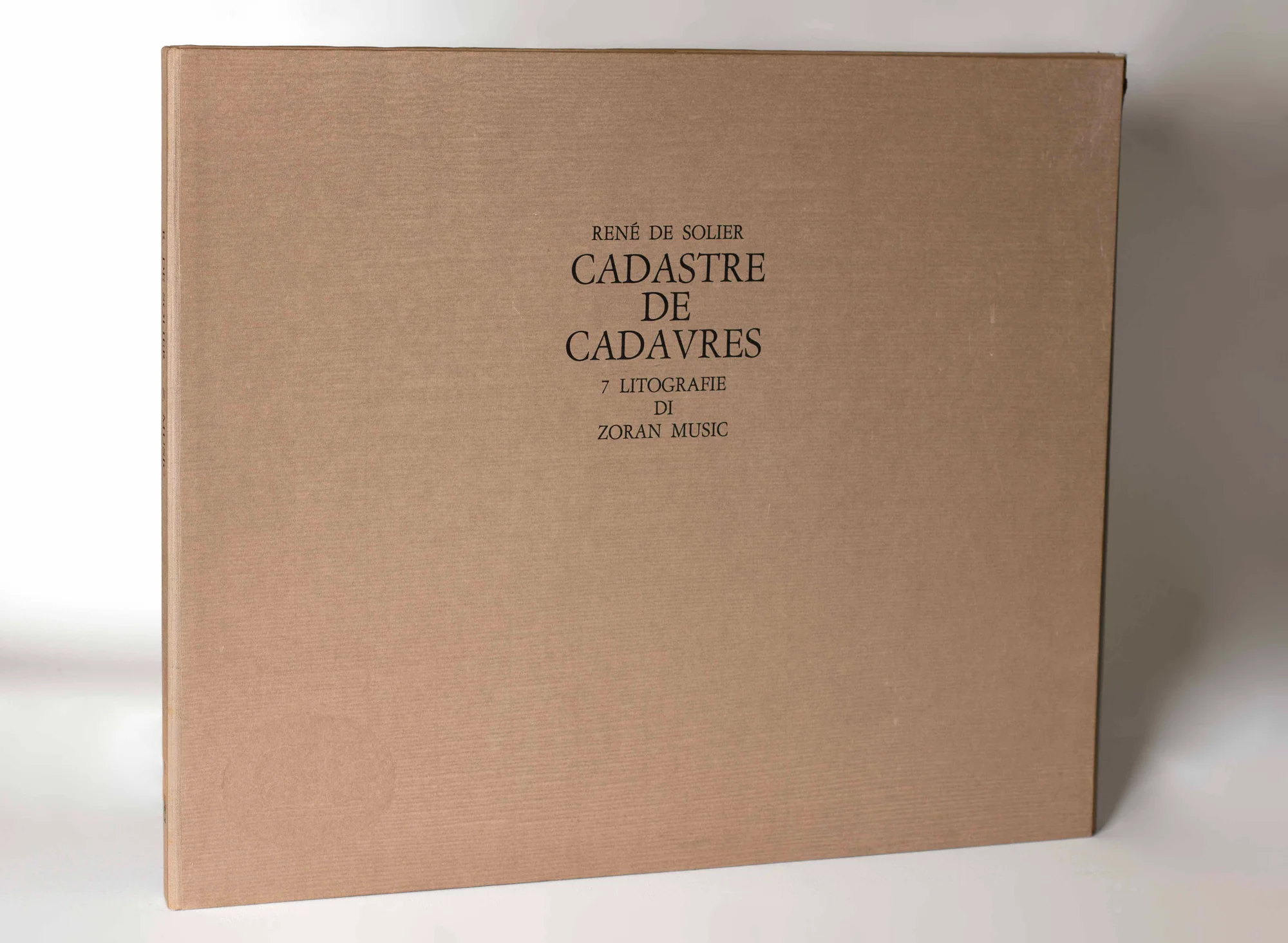 Milano, Cerastico éditeur, 1974, grand in-4, 44 x 55 cm, en feuilles, couvertures rempliées, dans un emboîtage éditeur à rabats, 50 p. Edition originale. 1/130 ex. num. comportant 7 lithographies originales en couleurs chacune signée et justifiée 63/130 par Zoran Music. On joint: - le manuscrit autographe du texte de René de Solier, un cahier 30 x 21 cm de 30 pages uniquement verso, la première ornée de cet envoi autographe signé : “pour Zoran, ces quelques traces, après l’épreuve, affectueusement, René” - 4 épreuves d’essai (Frélaut, 444) dans des coloris différents, chacune signée et annotée “Essai” (une planche, avec le texte sur 4 feuillets), une autre porte des marques de scotch) et une épreuve d’essai (Frélaud 443), uniquement en noir, signée et annotée “Essai”. Soit 4 lithographies supplémentaires. - On joint aussi une plaquette pour la présentation de l’ouvrage. datée avril 1974, in-8, br., 56 p. reproduisant 5 lithographies, texte de Marco Valsecchi en italien et français, biographie, beau portrait photographique de l’artiste, fac-similé du manuscrit de Solier, etc.Très bel exemplaire, personnalisé, de ce beau livre peu courant et méconnu. Frélaut 442-448.