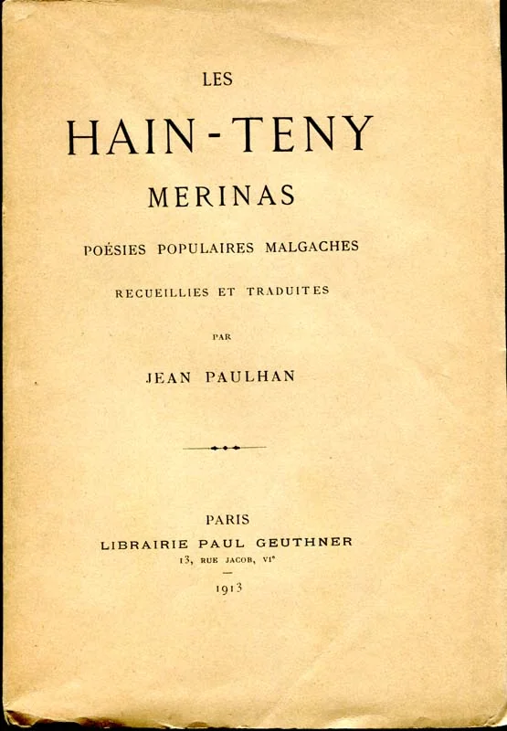 Poésies populaires malgaches recueillies et traduites par Jean Paulhan. P., Librairie Orientaliste Paul Geuthner, s.d. (1913), in-12, br., 461 p. Edition originale sur vélin (pas de tirage en grand papier) du premier livre de Jean Paulhan, enrichi d'un envoi a.s. à Bertha Rhodes. Cette artiste peintre anglaise travailla en Europe au début du XXe siècle et notamment en France. Elle fit le portrait de Paulhan et de ses parents qui tenaient la pension de famille où elle résida à Paris ; devenue une de ses proches, elle en fera son héritier. Rare, surtout en excellent état et non coupé, comme c'est le cas ici.