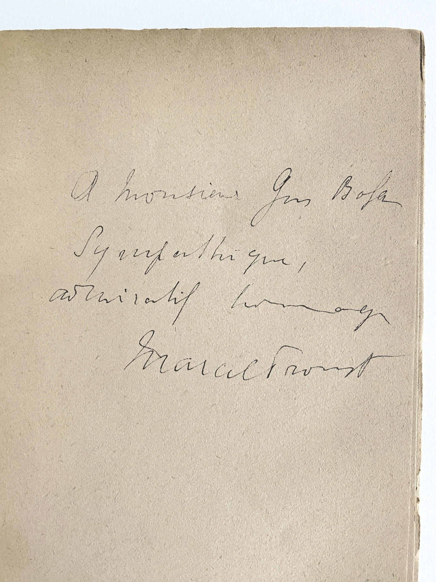 P., Éditions de la N.R.F., 1922, in-8, broché, chemise étui fantaisie de toile écossaise, pièce de titre de box noir, gardes de toile rouge (Atelier Devauchelle), 230 p. Édition originale. Envoi autographe signé à Gus BOFA : à Monsieur Gus Bofa, Sympathique admiratif hommage, Marcel Proust. Gus Bofa collabora au Crapouillot de 1922 à 1936 non en qualité de dessinateur mais de critique littéraire. Le titre de sa chronique s’intitulait Les Livres à lire et les autres. Elle paraît du 15 janvier 1922 jusqu’en 1939. Son article sur Sodome et Gomorrhe est paru dans le numéro du 16 juin 1922. Reste que tout le monde a en mémoire le célèbre portrait de Proust par Bofa; à contre-jour dans une boutique d’horloger dont l’enseigne : “À la Recherche du temps perdu” se lit inversé sur la vitrine. Penché, loupe en main, il examine le meilleur rouage d’un monticule de montres en pièces détachées. Synthèses littéraires et extra-littéraires paraît en 1923, c’est un recueil de 40 compositions d’une grande originalité et d’une grande inventivité. L’artiste réussit à donner sa vision, une synthèse à la fois de l’écrivain et de son œuvre, de quelques-uns des plus célèbres acteurs de la littérature. Les portraits n’ont pas été publiés au préalable dans la presse. Proust mort le 18 novembre 1922 n’a pu malheureusement en prendre connaissance.Huysmans, Kipling, Nietzsche, Proust, Morand, etc. Les Synthèses était une commande de l'éditeur Mornay, des bois gravés étaient prévus pour être finalement remplacés par des dessins au trait, coloriés au pochoir. Les portraits n'ayant pas été publiés au préalable dans la presse, Proust étant mort le 18 novembre 1922, n'a pu en prendre connaissance.
