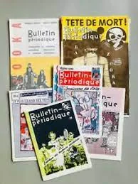 - Bulletin périodique : n° 1 à 7. Dir. : Paul Sigogneau, Christian Chapiron, Paris, Almonde-Bazooka Production, 1976-1978. 6 journaux en couleurs au format in-folio, en feuilles. COLLECTION COMPLÈTE. N° 1 (45,7 x 32 cm), n° 2 (45 x 32), n° 3 (44,3 x 31,5), n° 4 (44 x 31,5), n° double 5-6 (44 x 31), n° 7 (43,5 x 31). - Un Regard moderne : n° 0 à 5. Paris, Libération, janvier 1978-juillet 1978. 6 journaux en noir et blanc et en couleurs au format in-folio, en feuilles de 32 p. chacun. COLLECTION COMPLÈTE. N° 0 (41,7 x 31), n° 1 (42,7 x 31,5), n° 2 (42,3 x 31,8), n° 3 (42,5 x 31,1), n° 4 (40 x 29), n° 5 (40 x 29 cm). Kiki Picasso (François Chapiron), Loulou Picasso (Jean-Louis Dupré), Olivia Clavel alias Electric Clito, Lulu Larsen, Banabar (Bernard Vidal), Jean Rouzaud, et Ti5 Dur (Philippe Bailly) sont les artistes contestataires de ce groupe d'avant-garde des années 70, issus des Beaux-Arts. Ils collaborèrent en 1977 au journal Libération, détournant les images et donnant le ton d'une critique politique radicale. " Ils redessinent ainsi les photos de presse des reporters ou transmises par bélino. Ils choisissent des images violentes, dures, spectaculaires. Ils les épurent en accentuant le caractère de l'évènement. Graphisme incisif qui en souligne encore la violence. Par ce traitement l'impact de l'image se trouve renforcé " (Jean Seisser, La gloire des Bazooka, 1981). Insérés dans deux élégants porte-folios de Julie Nadot toilés noir à 4 rabats avec le graphisme du Bulletin périodique et d'Un Regard moderne repris, imprimé sur papier et contrecollé sur le premier plat (bleu et rose).