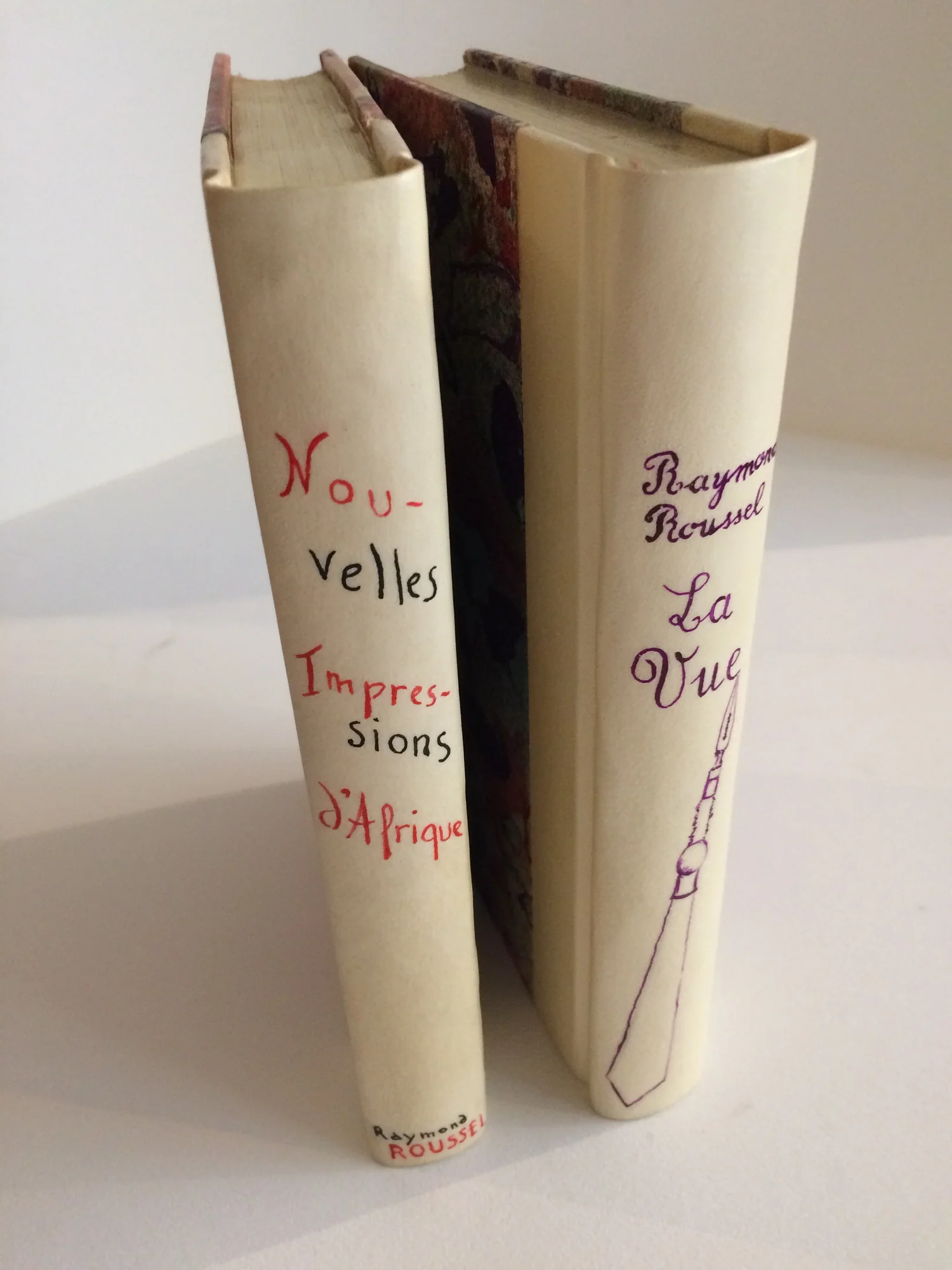 - Nous joignons : ROUSSEL (Raymond). Nouvelles Impressions d’Afrique. Suivies de L’Ame de Victor Hugo. Ouvrage orné de 59 dessins de H.-A. Zo. Paris, Alphonse Lemerre, 1933, in-12, reliure bradel demi-vélin blanc, titre du dos en rouge et noir, tête dorée, couvertureconservée, 313 p. Mention fictive de troisième édition.Les deux exemplaires ont été établis dans l’atelier de reliure de l’Abbaye de Maumont, ils sont ravissants avec leurs dos peints aux encres de couleurs.