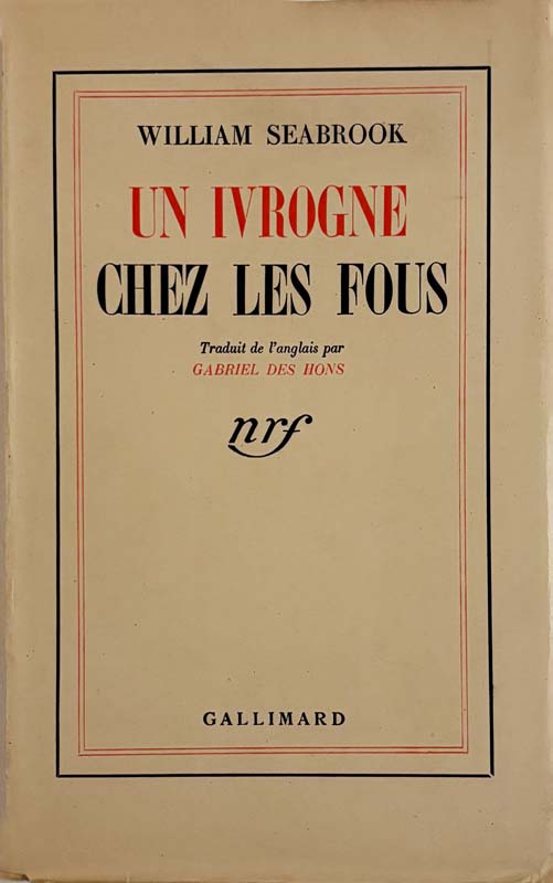 Traduit de l'anglais par Gabriel Des Hons.Paris, N.R.F., 1938, in-12, br., 258 p. Edition originale française. 1/30 ex. num. sur alfa Lafuma Navarre (seul tirage en grand papier). Écrivain, aventurier et reporter américain, William B. Seabrook fut l’un des meilleurs vulgarisateur en Occident des sociétés primitives et de leurs rites ancestraux. Ses ouvrages sur le Vaudou ou sur le cannibalisme connurent un grand succès tant aux États-Unis qu’en France où l’auteur séjourna longtemps. Alcoolique impénitent, Seabrook se fit lui-même interner en 1933 dans un asile d’aliénés près de New York pour en sortir au bout de huit mois. La parution l’année suivante d’Asylum eut un grand retentissement, d’autant qu’il raconte son expérience au sein de l’établissement comme le compte rendu d’une expédition dans la brousse. Bel exemplaire.