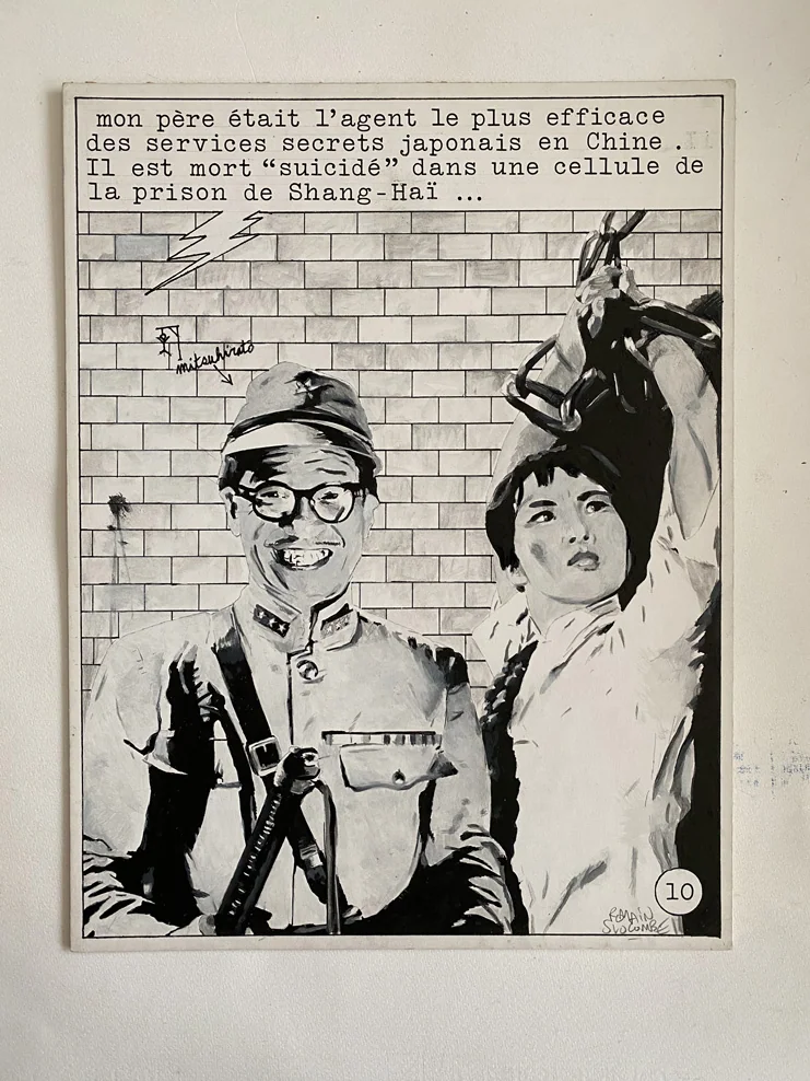Encre et gouache sur carton fort. Format 32, 4 x 25 cm, signée au crayon en bas à gauche. Reproduite dans l’album Prisonnière de l’armée rouge! page 30 (Les Humanoïdes Associés, 1978). Romain SLOCOMBE est né à Paris en 1953. Pendant ses études aux Beaux-Arts à Paris, il est proche du groupe de graphistes radicaux Bazooka. Peintre, illustrateur, affichiste, Xerox-artiste, il touche à toutes les techniques de l'expression graphique. Ses activités vont de l'illustration de couvertures de romans à la bande dessinée, en passant par l'image de presse, la sérigraphie, le collage et la littérature enfantine. À partir de 1977, il commence à voyager au Japon et fréquente notamment le peintre Tadanori Yokô, les illustrateurs Yôsuke Kawamura, Shigenari Onishi, Makiko Azakami, et le photographe Nobuyoshi Araki. Parallèlement à son travail d'illustrateur de B.D., il fait de la photo et des films. Il est très attiré par le thème de l'érotisme japonais, sur lequel il écrit. Ses personnages sont souvent de jeunes japonaises plâtrées ou entourées de bandages médicaux.